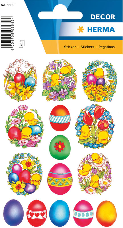 Süße, selbstklebende Ostersticker für Ihre Osterdekoration. Ostergrüße, Geschenke und Bastelarbeiten bekommen eine individuelle und moderne Note für einen bunten Ostertisch. Bunte Ostereier, blühende Blumen oder niedliche Küken - auf dem Stickerbogen "Oster Kompositionen" von HERMA findet sich alles, was man an Ostern braucht. Diese farbenfrohen Sticker von HERMA lassen zu Ostern keine Wünsche offen. Die detailreich gestalteten Aufkleber aus Papier verzieren Briefe, Grußkarten, oder Einladungen und machen sie zu einem ganz persönlichen Oster-Highlight. Natürlich lassen sich mit diesen wundervollen Stickern auch langweilige Geschenkverpackungen optisch aufwerten. Zum Dekorieren eignen sie sich genauso gut wie zum Sammeln oder Tauschen. Insgesamt befinden sich in einer Packung dieser Sticker 3 Stickerbögen mit jeweils 15 unterschiedlichen Oster-Stickern. Die permanent haftenden Aufkleber sind selbstklebend und somit kinderleicht auf glatte und fettfreie Flächen aufzukleben.