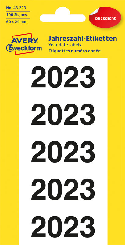 Year numbers 2023 white - Allows clean sorting by years. Different colors of the year numbers facilitate differentiation. Absolutely opaque to reliably cover old lettering. Ideally suited for clearly organizing your files by year.